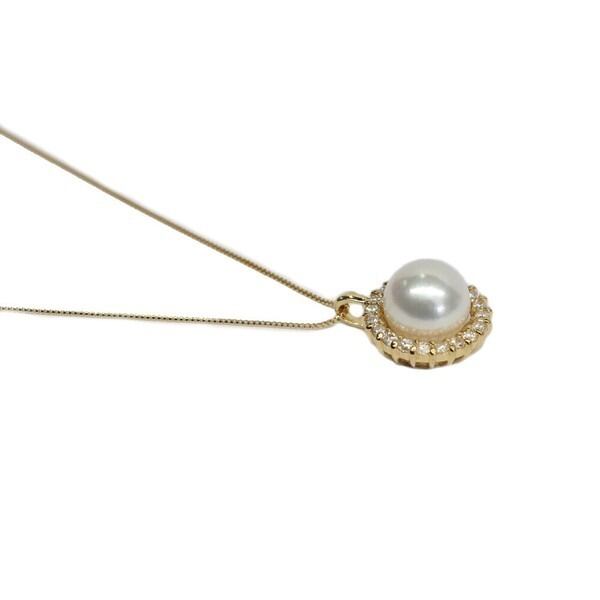 アコヤ真珠をぐるりと囲むようにセッティングされたダイヤモンドが、上品かつ華やかな印象を演出します。