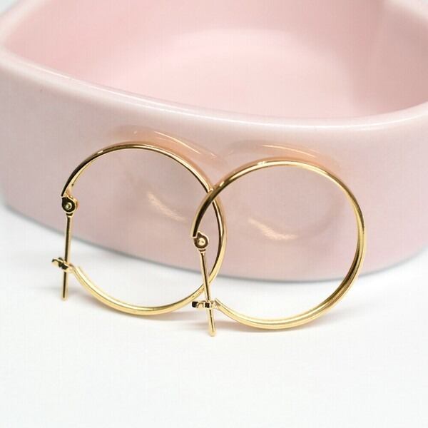 K18で仕上げた人気のフープピアス。見た目は丸みのあるパイプ型ながら、コストを抑えるために半甲丸の「溝線」を使用しています。