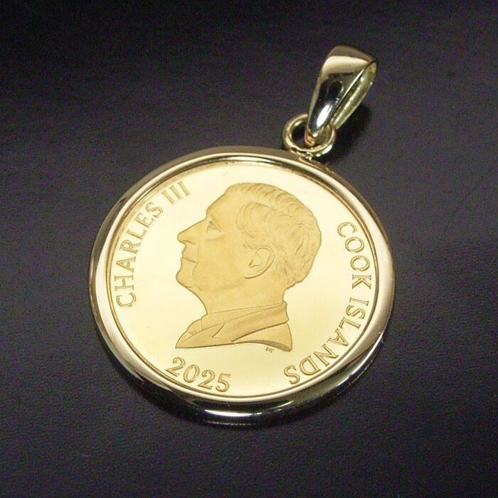 2025年限定の純金(K24)コインネックレス ペンダントトップのみのご紹介です。希少価値の高い四つ葉のクローバーモチーフが施されており、幸運の象徴として人気のデザインとなっています。コインはイギリス発行で、1/30オンスの純金製。枠とバチカンには18金を使用しています。