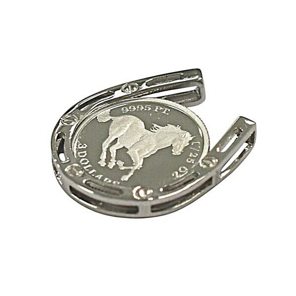 **プラチナ1000製のホースコイン(1/25オンス)**を、縁起の良い馬蹄(ホースシュー)デザインの枠(プラチナ900)にセッティングした贅沢なペンダントトップです。