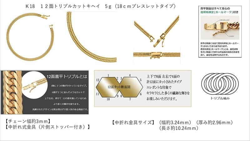 【18金】喜平ブレスレット18cm 5g 12面トリプル カット K18 中折れ